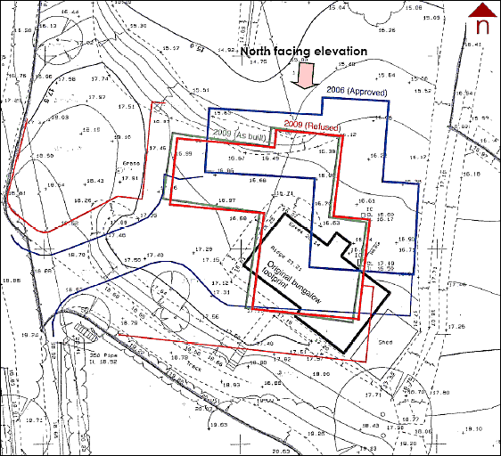 The diagram above comes from the new application (Design and Access Statement, P21). This admits to the unauthorised building being constructed further up the slope (and closer to the footpath) thus increasing its intrusiveness compared to the approved plan. The applicant claims that this new position was approved by an officer in July 2007. Similarly the claim is made that the nearly 100 sq. metres of lower ground floor space and a high retaining wall were changes consented to at the same time. There has been absolutely no evidence of this on the planning file. It is highly questionable that an officer would have the authority to agree to such major changes which would normally require an application for approval.