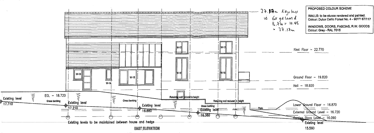 One particular drawing of note, which our representative raised can be seen here. This is of the east elevation and shows various levels. It appears to show the previously existing ground level as well as showing the path and land around the structure as rather higher than before. It was presented to illustrate that certainly on the northern side (right of picture) there was never any attempt to ‘cut in’ the building form, down into the slope of the surrounding ground level. Instead, we believe the land around the structure to the west and south has been raised during 2007 by up to 2 metres, and we will continue to present evidence that levels have been raised by material brought onto site. In this case, however, it was pointed out by the architect that the existing levels line might have been the hedge, and the architect could not recall where he had taken as being the line. But we were able to demonstrate that the landscape plan originally submitted with this application showed it to be about half- way between the hedge-bank and the eastern elevation of the building and the levels shown on that plan correspond to those shown on this elevation drawing.