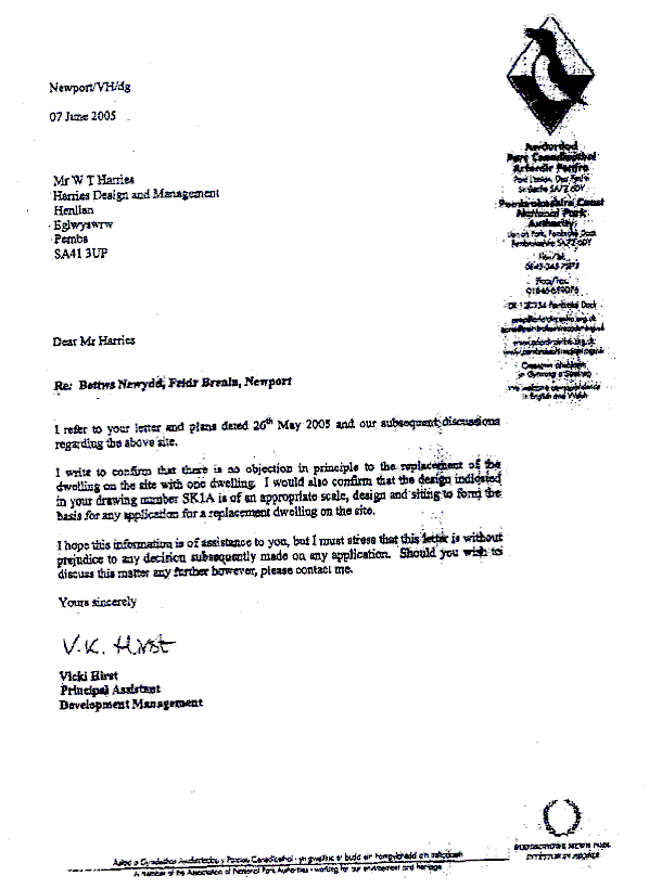 Members were reminded that in March 2006 an application for a replacement dwelling on a plot to the rear of The Parrog, Newport was considered. The replacement was modern, and considered by all parties to be an acceptable approach as it did not relate directly to adjoining traditional properties. The report before Members that day stated that the details of the design required further discussion in particular the overall height of the structure, the roof balcony and the detailing particularly of the elevation facing the road and the application was delegated to the Chief Executive (National Park Officer) to issue consent on the receipt of amended plans altering the detailed design and subject to an issue relating to the badgers sett. Following the submission of revised drawings, planning permission had been issued, but despite references to height in the report, this was not addressed specifically[5], although major improvements to the design were achieved.