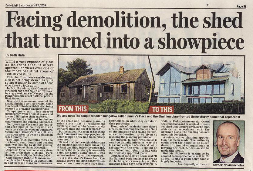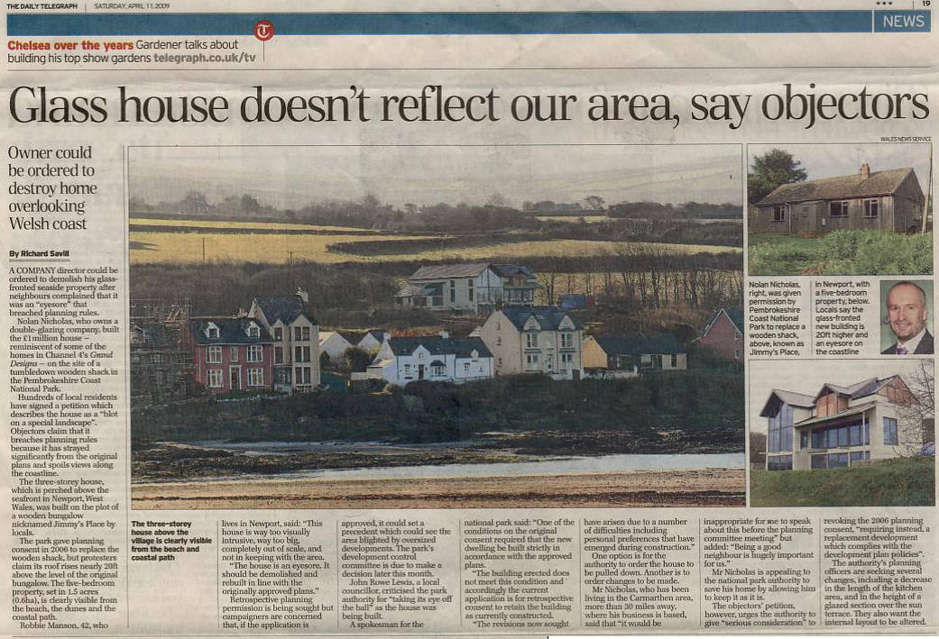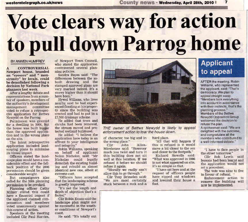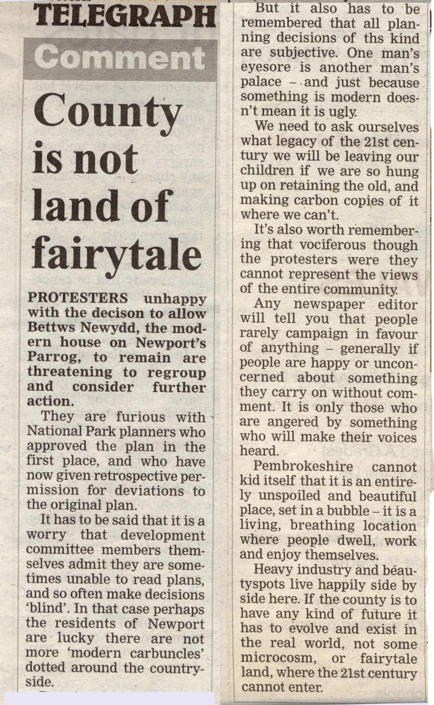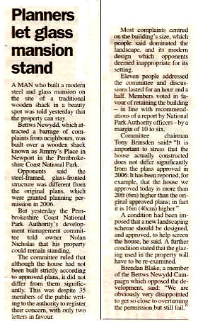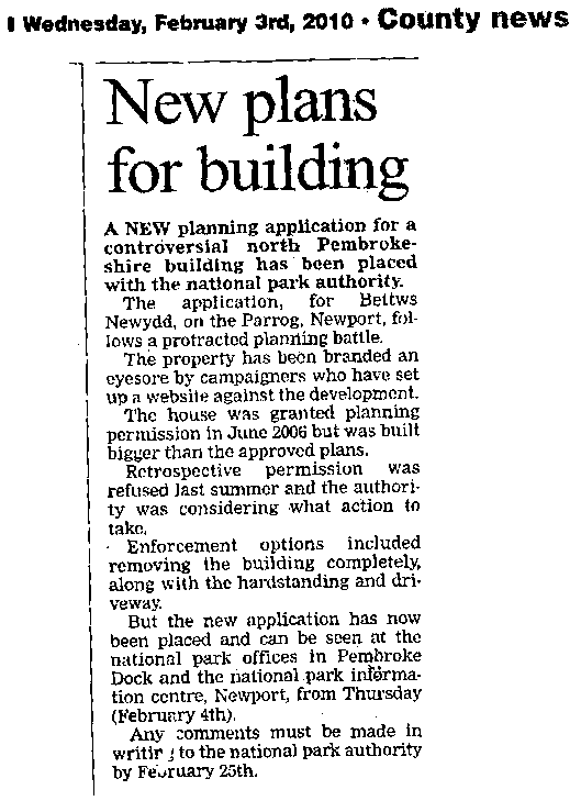 3rd March 2010: A Western Telegraph article was published today about the Newport Town Council decision to oppose the New Application (they also opposed the previous application). An on-line version is here. The article reports on the views expressed and concludes by noting that the council voted to oppose the new application by a majority of 5 to 1, with 3 abstentions. Not exactly a "torn council" as headlined in the article, and a convincing vote against, despite an attempt the previous week by Catherine Milner, of the National Park Planning Department, to persuade the council to judge the application by comparison with the 2006 consent and not Jimmy's house. The incorrect information and guidance she reportedly gave is the subject of our press release reported below.