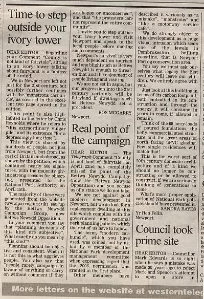 14th April: New letter in the Western Telegraph entitled "Losing the Planning Plot"