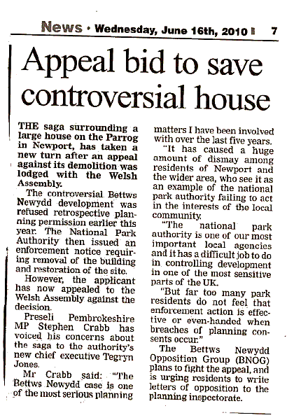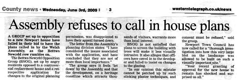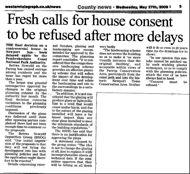 3rd June: A Western Telegraph article reports the rejection of our "call-in" application by the Welsh Assembly Government. It also mentions the Newport Town Council Council's Letter of Complaint which was sent to Nic Wheeler (Chief Executive of the National Park).