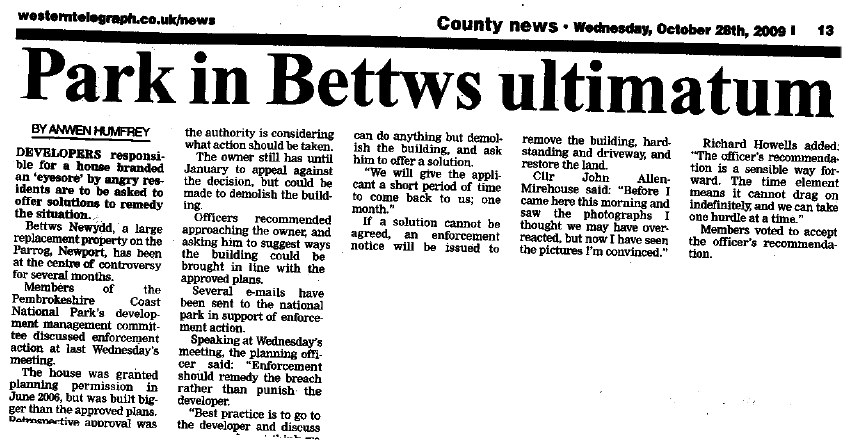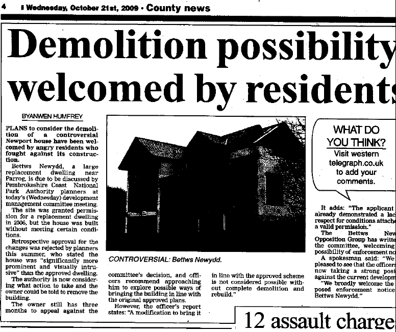 21st March 2010: More press coverage: Click here to read a letter in the County Echo recommending that Bettws Newydd be demolished and you can also click here to see the online version of the article published in last Wednesday's Western Telegraph.