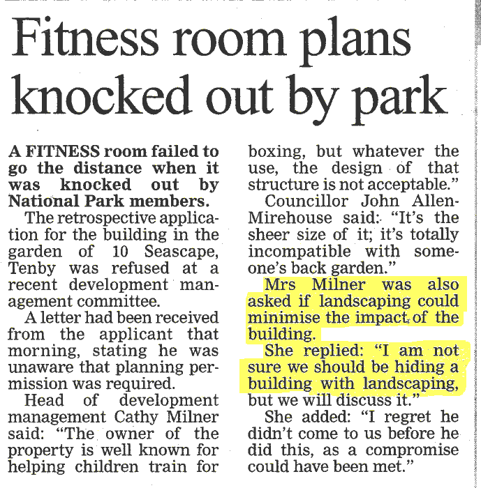 12th May 2011: The Monitoring Officer’s Report has been published and you can see it here. It was considered at a full meeting of the National Park Management Committee today. A good report of the meeting can be seen in this BBC News Item. There’s also a report in The Western Telegraph. The National Park has admitted many failings and promised to improve its processes, and words were said about ensuring nothing like this happens again. The total cost of this case to the National Park was stated in the report as £77,000. The Report was unanimously accepted and progress in implementing recommendations will be considered in October 2011 (although some Members of the Authority have already expressed doubt whether recommendations from the Monitoring Officer, a lawyer, could be practically implemented by a Planning Departrment). We have been taken aback that the Report only set out to look at systems failure, and in its conclusions and recommendations that is all that it does. Alleged maladministration by Officers who should now, in our view, be brought to account if upheld was not highlighted. We remain unconvinced that mere process changes will improve the culture in the planning department that led to this eyesore being inflicted on the community and many visitors to Newport. In a letter sent before the meeting we asked for the matter to be referred to the Standards Committee, and mentioned that not all our complaints had been dealt with satisfactorily. This letter was read by Members of the Authority yesterday but not considered.