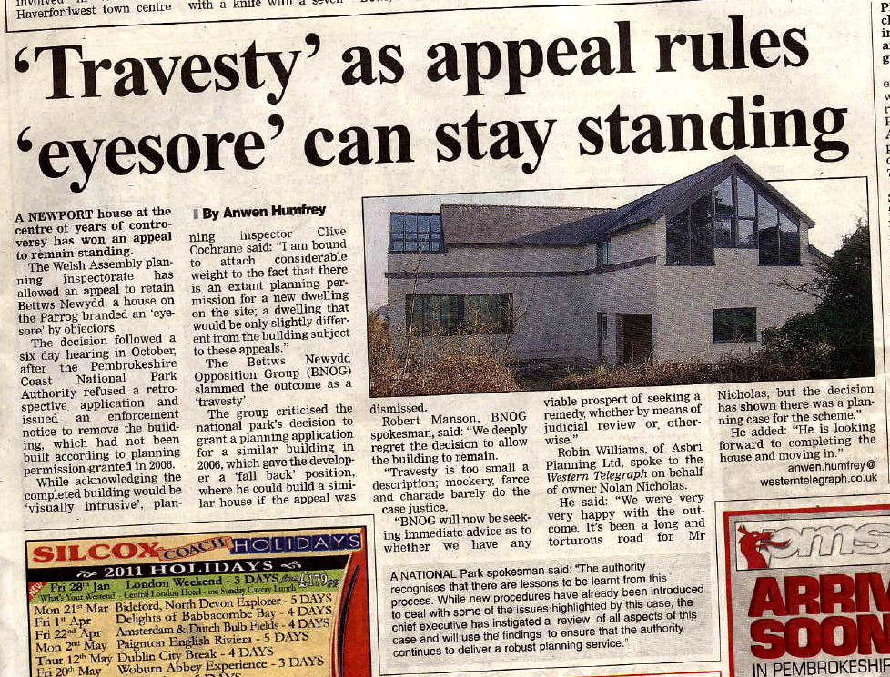 25th January 2012: The Western Telegraph today published an article in response to our statement which does cover many of our points. There is also a response from the National Park which, in our view, makes it clear they have no intention of taking action against the planning officers responsible for the many mistakes and this was confirmed in this reply to our letter received from Tegryn Jones.