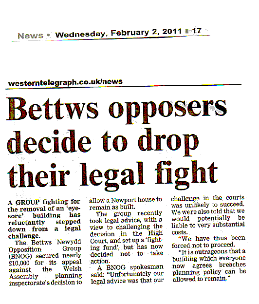 2nd February 2011: The Western Telegraph has reported the decision not to proceed with legal action. Click here to view a copy. At least they did print our point about the building having been found to breach planning policy - something absent from previous reports.